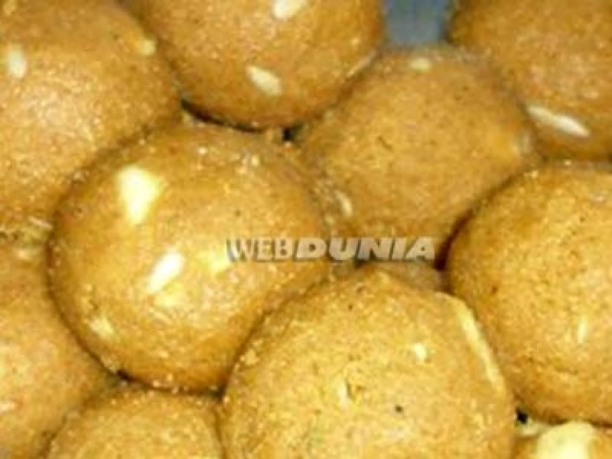 कृती : प्रथम डाळ चार ते पाच तास पाण्यात भिजत घालून ठेवावी. नंतर स्वच्छ धुऊन पाट्यावर रवाळ वाटून घ्यावी. नंतर ती वाटलेली डाळ तुपामध्ये चांगली तांबूस होईपर्यंत भाजावी. साखरेचा दोन-तारी पाक करून त्यात तो भाजलेल्या डाळीचा रवा व इतर साहित्य घालावे. हे मिश्रण तसेच ठेवून द्यावे. अर्ध्या-पाऊस तासाच्या अंतराने वरचेवर खालीवर करावे व वर तूप आल्यास ओतून काढावे. सकाळी केल्यास संध्याकाळी लाडू वळता येतील.