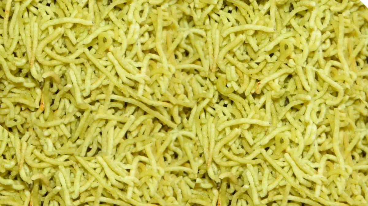 एका परातीत बेसन व बटर मिक्स करून घ्या. मग त्यामध्ये मीठ, हिंग, हळद घालून मिक्स करून पुदीनाचे पाणी घालून मिक्स करून शेवेचे पीठ चांगले मळून घ्या. शेवेच्या पिठाला तेलाचा हात लावावा.
