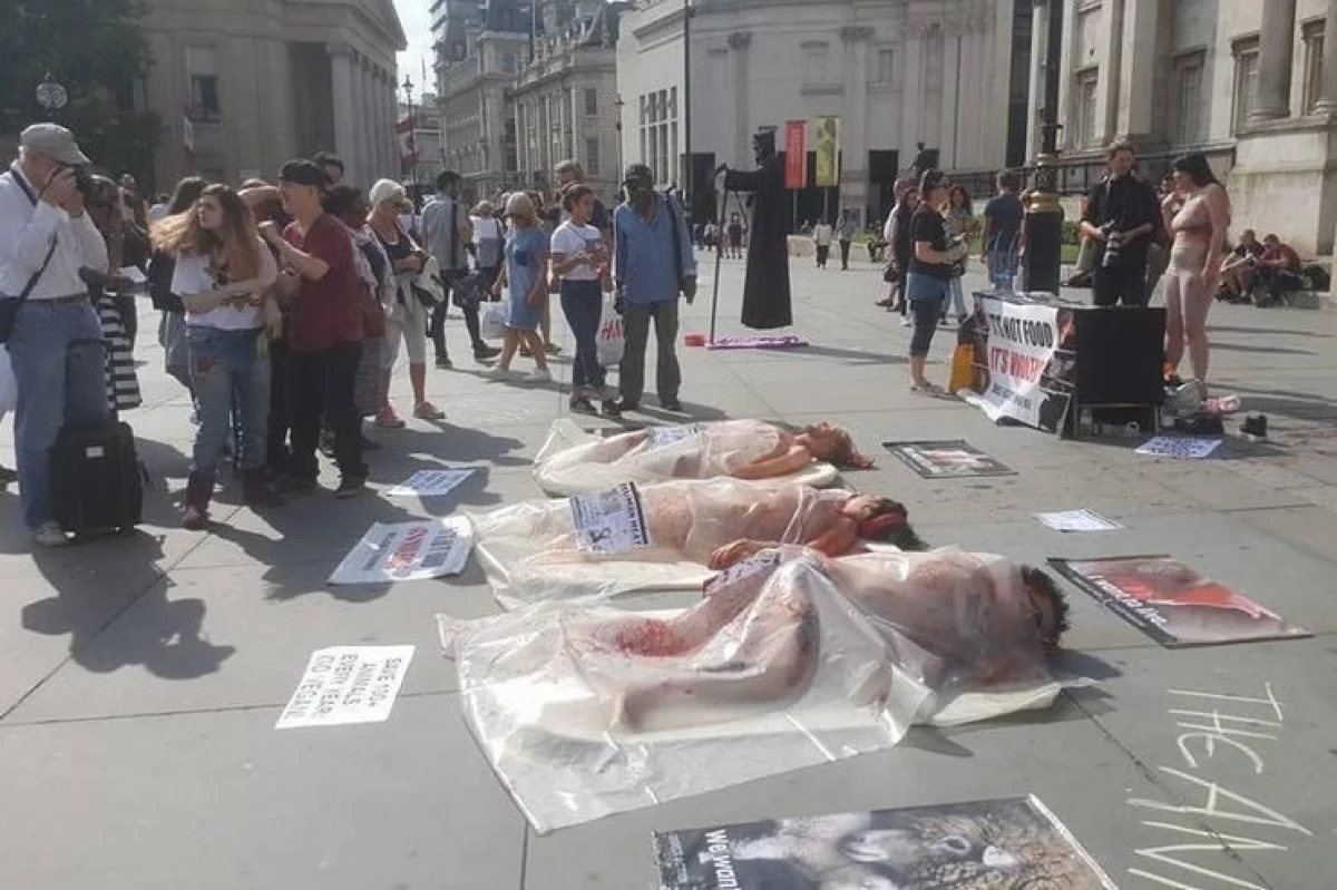 लंडनच्या रस्त्यावर बिकनी घातलेल्या मुली रस्त्यावर पडलेल्या होत्या, रक्ताने शरीर माखलेल्या या मुली प्लास्टिकने झाकलेल्या होत्या, एखादे शव झाकल्यासारखे. हे दृश्य पाहून लोकं हैराण होत होते. मुलींच्या शरीरावर मानवी मटण असल्याचे लेबल लावण्यात आले होते. खरे तर हे लोक स्पेसिएसिस्मचा विरोध करत होते, काही मुलींनी जमिनीवर पडून प्रदर्शन केले.स्पेसिएसिस्म म्हणजे प्राण्यांचे जीवनही अनमोल आहे, त्यांनाही जगण्याचा अधिकार आहे. याकडे त्यांनी लक्ष केंद्रीत केले, तसेच जनावरांनाही जगण्याचा अधिकार असल्याचे म्हटले आहे. लोकांना त्यांनी शाकाहारी होण्याचे आवाहन केले, कारण मटणासाठी प्राण्यांचे जीव घेतला जातो.