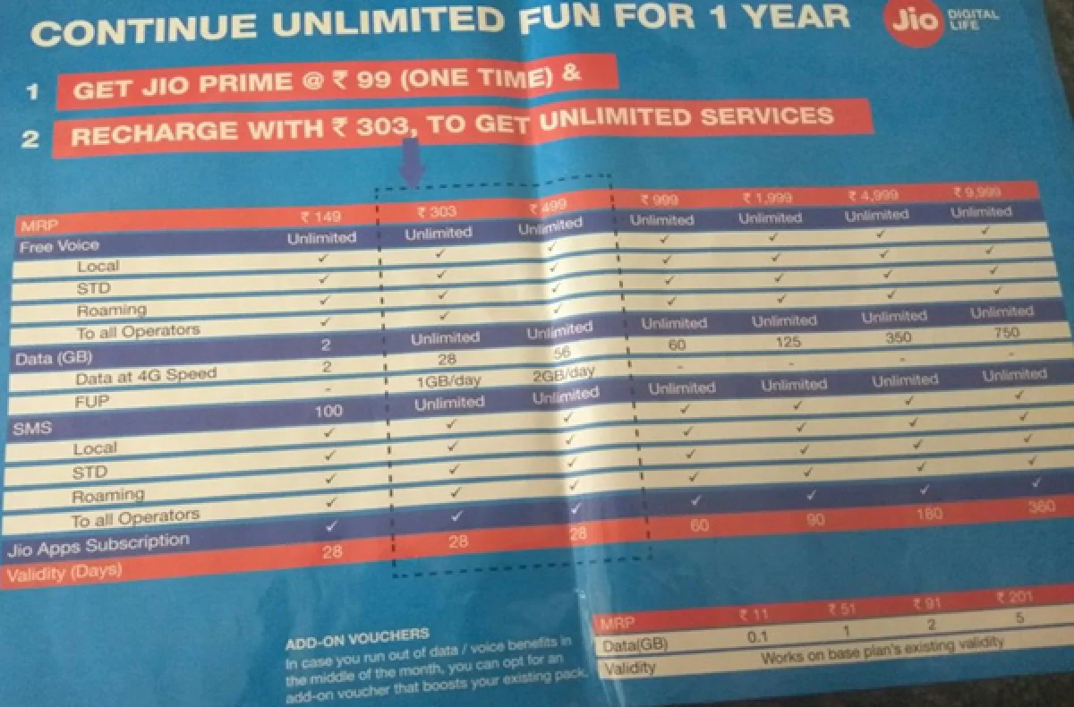 * 303 रुपयेच्या प्लानमध्ये उपभोक्ताला 28 जीबी 4 जी (1 जीबी दररोज) डेटा मिळेल. याव्यतिरिक्त 128 केवीपीएस स्पीडने अनलिमिटेड डेटाही मिळेल. एसएमएस आणि कॉलिंग सुविधा फ्री राहील. मेंबर नसल्यास केवळ 2.5 जीबी डेटा दरमहा मिळेल.
