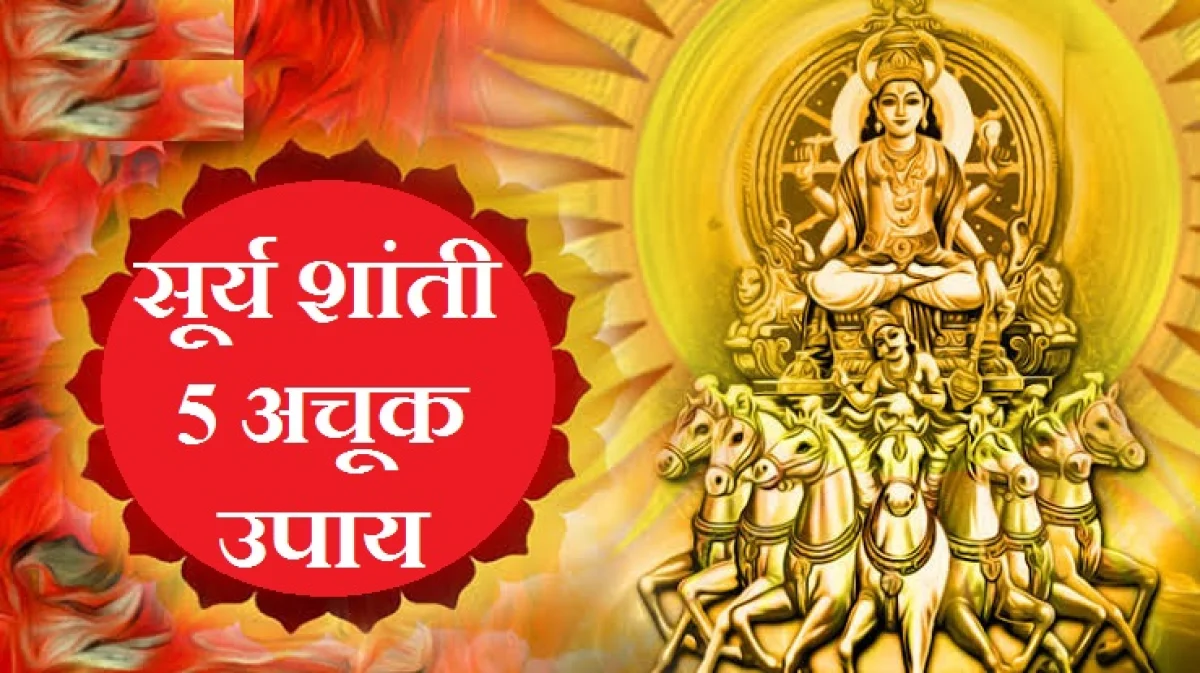 सूर्याच्या शांतीसाठी सकाळी अंघोळ केल्यानंतर सूर्यदेवाला जल अर्पित केलं जातं. नंतर सूर्य संबंधित वस्तूंचे दान, जप, होम मंत्र धारण व सूर्याच्या वस्तूंनी जल स्नान करणे देखील सूर्याच्या उपायांपैकी आहे. सूर्याच्या शांतीसाठी या पाच विधींपैकी एक विधी उपयोगात आणता येऊ शकते. गोचरमध्ये सूर्याचे अनिष्ट प्रभाव दूर करण्यासाठी हे उपाय विशेष रूपात प्रभावी ठरू शकतात.