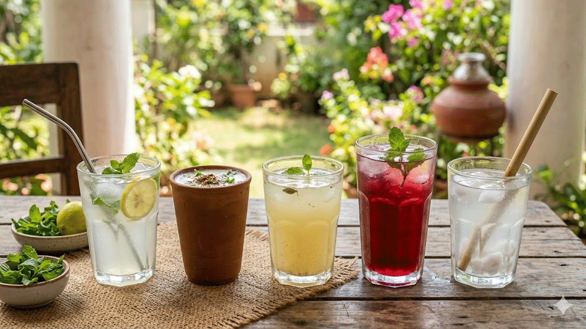 उन्हाळ्याच्या कडाक्याच्या उन्हात शरीरातील पाण्याची पातळी कमी होते आणि थकवा जाणवतो. अशा वेळी बाजारात मिळणारी थंड पेये पिण्यापेक्षा घरगुती नैसर्गिक पेये पिणे आरोग्यासाठी कधीही उत्तम. शरीराला आतून थंडावा देणारी आणि ऊर्जा वाढवणारी ५ सोपी घरगुती पेये खालीलप्रमाणे आहेत: