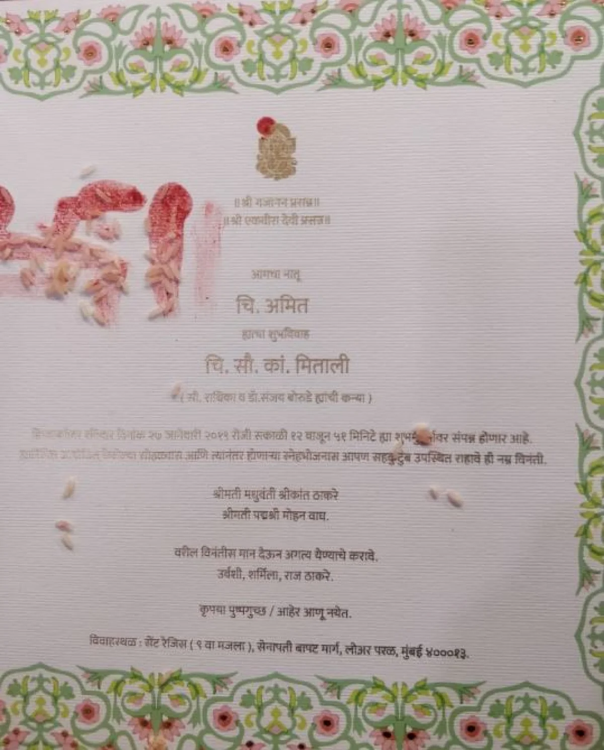 मनसे प्रमुख आणि मराठी महाराष्ट्रात सर्वाधिक लोकप्रिय असेलेले नेते राज ठाकरे यांचा पुत्र अमित ठाकरे यांचे लग्न २७ जानेवारी राजो होणारा असून, राज ठाकरे यांनी लग्नाची प्रत्रिका सप्तशृंगी देवीला विधिवत अर्पण केली आहे. या पत्रिकेत फक्त ५ लोकांची नावे आहेत. राज ठाकरेंची आई मधुवंती श्रीकांत ठाकरे, सासू पद्मश्री मोहन वाघ यांच्यासह मुलगी उर्वशी, पत्नी शर्मिला आणि स्वत: राज ठाकरे यांचं नाव आहे.