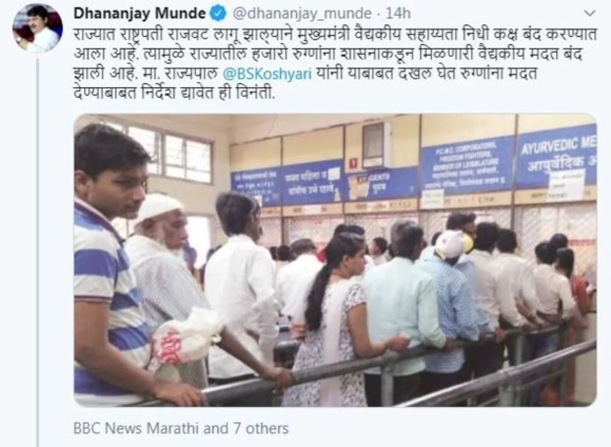 विधानपरिषदेचे विरोधी पक्षनेत धनंजय मुंडे म्हणाले, "राज्यात राष्ट्रपती राजवट लागू झाल्याने मुख्यमंत्री वैद्यकीय सहाय्यता निधी कक्ष बंद करण्यात आला आहे. त्यामुळे राज्यातील हजारो रुग्णांना शासनाकडून मिळणारी वैद्यकीय मदत बंद झाली आहे. राज्यपाल भगतसिंग कोश्यारी यांनी याबाबत दखल घेत रुग्णांना मदत देण्याबाबत निर्देश द्यावेत ही विनंती"