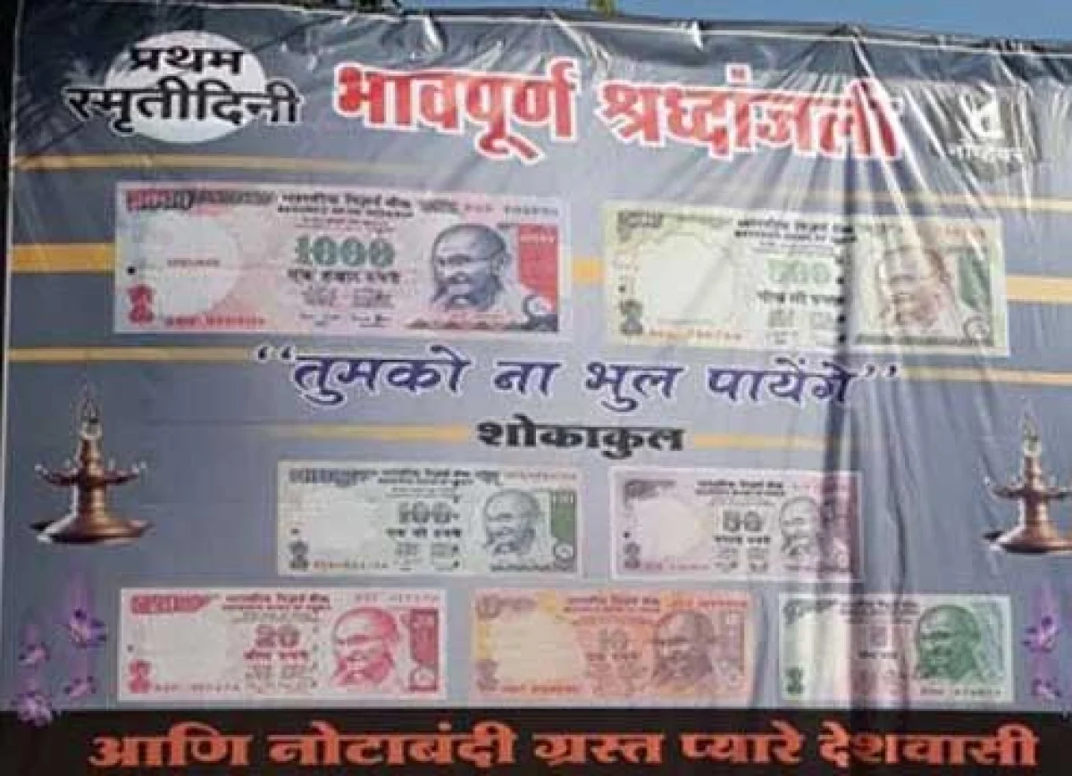 पुणेकरांनी जुन्या नोटांचा फलक करून "तुमको ना भूल पाएंगे" या शब्दांत श्रद्धांजली वाहिली आहे. सिंहगड रस्त्यावर जुन्या नोटांसह हा फलक लावण्यात आला आहे. हा फलक लोकांचे लक्ष वेधून घेत आहे.