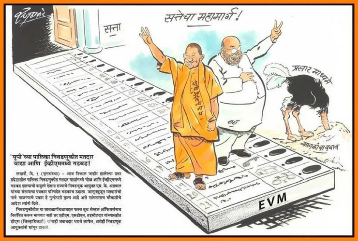 बाजूला यूपी पालिका निवडणुकीत मतदार याद्यांत आणि ईव्हीएममध्ये घोळ झाल्याची बातमी देण्यात आली आहे. या बातमीचा संदर्भ हा व्यंगचित्रासाठी देण्यात आला आहे. मतदारांची मतदान यांद्यामधून नावे उडवणे, तसेच ईव्हीएममध्ये गडबड झाल्याची कबुली देताना राज्याचे निवडणूक आयुक्त एस के अग्रवाल यांच्या संतापाचा भडका पत्रकार परिषदेत उडाल्याचा, संदर्भ बातमीत देण्यात आलेला आहे.
