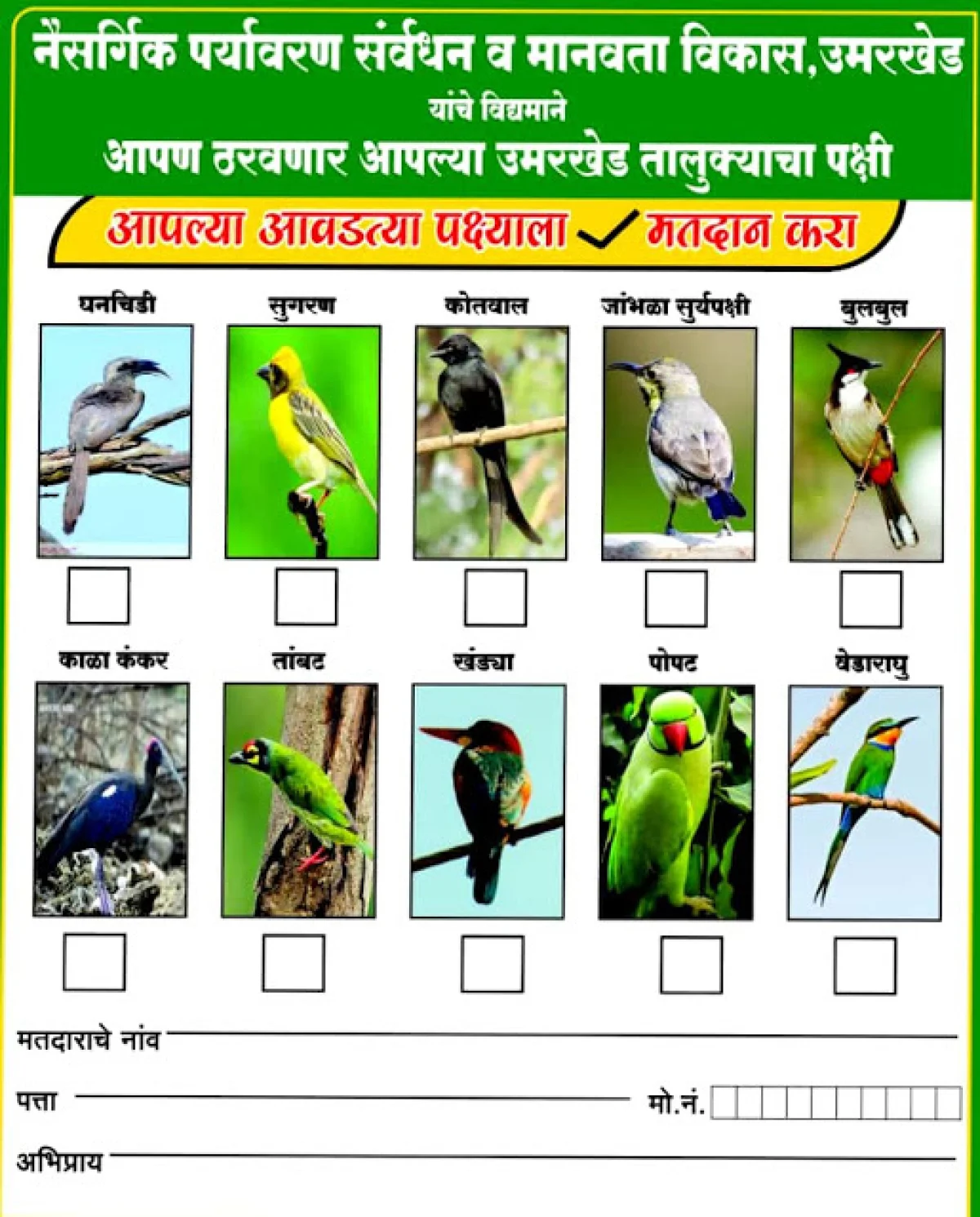 गावाचा पक्षी ठरवण्यासाठी चक्क गावात मतदान घेतले जाणार आहे. या निवडणुकीस १० पक्षी उभे राहिले असून, जो पक्षी जास्त मते मिळवेल तो गावाचा पक्षी म्हणून ओळखला जाईल व त्याची विशेष काळजी गावातील नागरिक घेणार आहेत. यवतमाळ :- विदर्भातील दुसरी व महाराष्ट्रातील तिसरी ठरणाऱ्या उमरखेड तालूका पक्षी निवडणुकीचा प्रारंभ दि. 30 जुलै 2018 पासून होत आहे. नैसर्गिक पर्यावरण संवर्धन व मानवात विकास, उमरखेड अंतर्गत या निवडणुकीचे आयोजन करण्यात आले असून निवडणूक रिंगणात 10 पक्षी उमेदवार आहेत. निवडणूक ऑनलाईन व ऑफलाईन या दोन्ही पध्दतीने घेतली जाणार आहे. उमरखेड तालुक्याचापक्षी निश्चित करण्यासाठी दहा पक्ष्यामधून निवडून आलेल्या पक्ष्याला तालुका पक्षी घोषित केले जाणार आहे. उमरखेड तालुकापक्षी निवडणूक ही महाराष्ट्रातील तिसरी व विदर्भातील दुसरीच निवडणूक ठरणार आहे. उमरखेड तालुक्यातील लोकांना पक्षी जीवनाची ओळख व्हावी तालुक्याची पक्षीप्रेमी व पर्यावरण स्नेही ही ओळख व्हावी या उद्देशाने या आगळ्या वेगळ्या उपक्रमाचे आयोजन करण्यात आले आहे.
