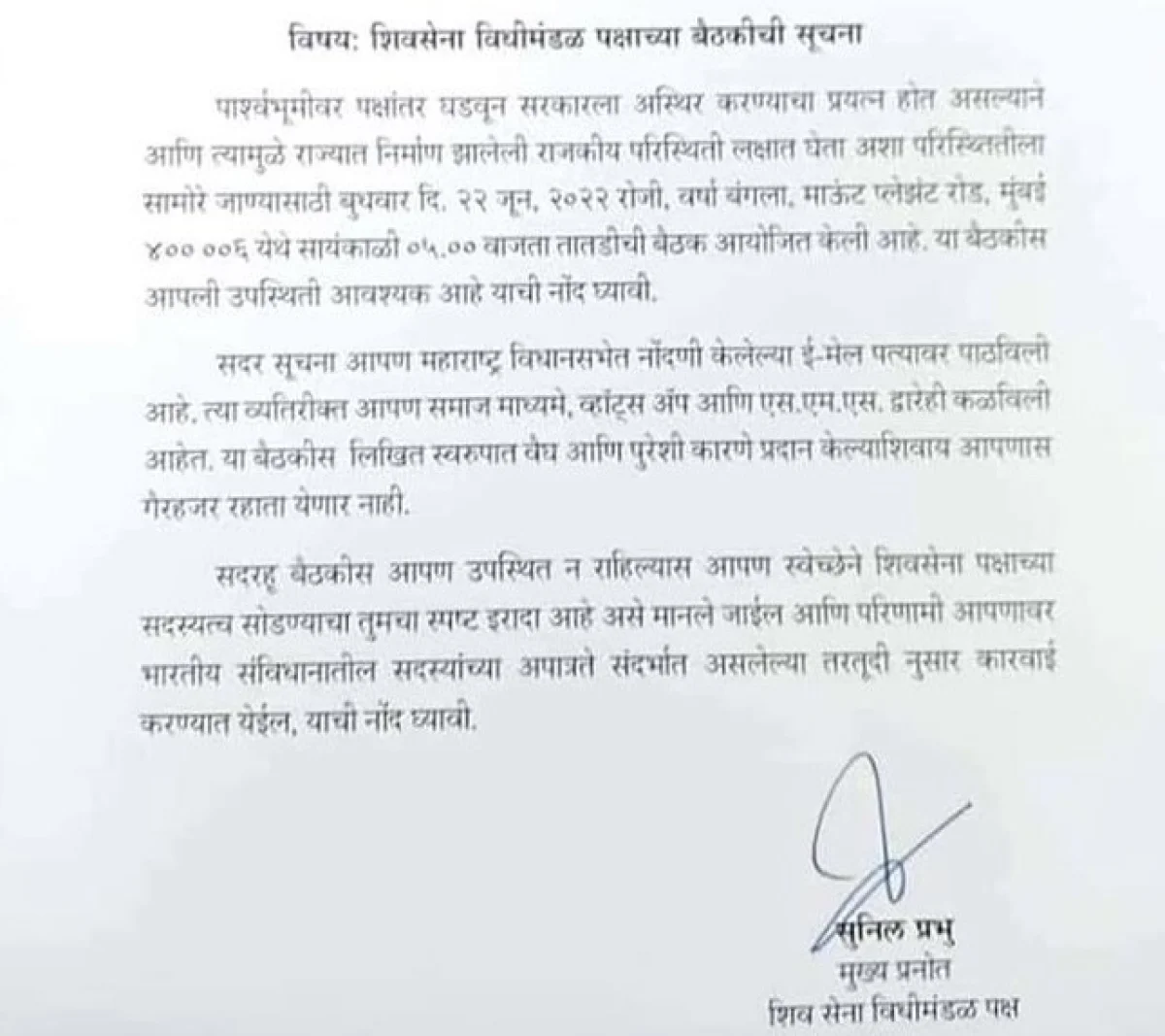 शिवसेनेच्या सर्व आमदारांना ई-मेल, एमएमएस आणि व्हॉट्स ऍप द्वारे याची नोटीस पाठवण्यात आली आहे. 'सबळ कारण दिल्या शिवाय या बैठकीला उपस्थित राहता येणार नाही. तसंच बैठकीला उपस्थित राहिले नाहीत तर त्या आमदारांनी स्वेच्छेने पक्ष सोडण्याचा इरादा केल्याचं मानलं जाईल,' असं शिवसेननं आमदारांना पाठवलेल्या पत्रात म्हटलं आहे.